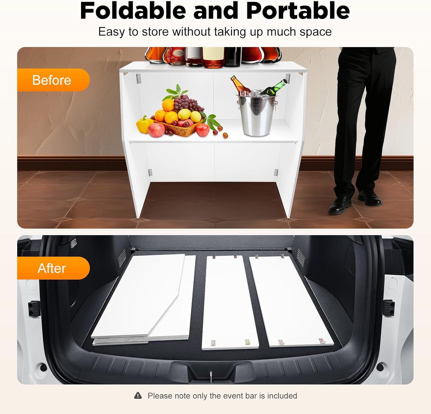 SpecificationColor: WhiteStyle: ModernShape: RectangularProcess: Edge Banding Material: Aluminum and Ecological BoardAssembly Required: YesMount Type: FreestandingUpper Tier Load Capacity: 50kg/110lbsLower Tier Load Capacity: 30kg/66lbsOverall Product Size: 121.29*49.53*108.59cm/47.75*19.5*42.75inPackage Size: 110*52*12cm/43.31*20.47*4.72inGross Weight: 15kg/33.07lbsNet Weight: 13kg/28.66lbsPackage Included1* Portable Event BarNotes1.Please note that items such as alcohol are not included in this product.2.Please allow the slight color difference caused by the shooting light and 1-3cm error due to manual measurement, and make sure you do not mind before ordering.