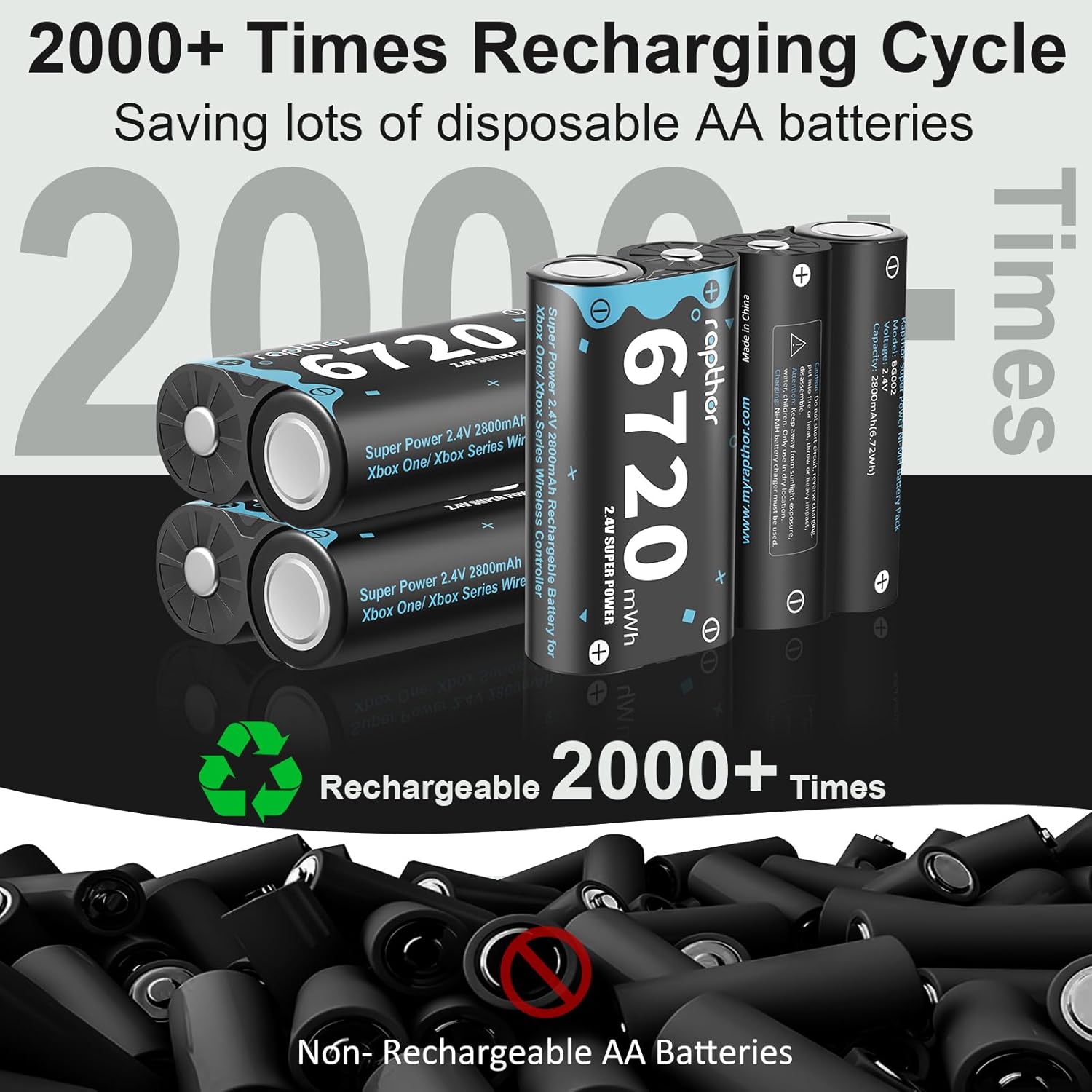 Rapthor 6720mWh High Capacity Controller Battery Pack for Xbox (4 Battery Packs+1 Fast Charger) Compatibility: Rapthor xbox battery pack compatible with Xbox Series X/Series S/Xbox One/ One S / One X/ One Elite controllers. Features of Xbox Controller Batteries 1. Higher capacity: up to 6720mWh, 25+ hours playing time for each xbox rechargeable battery pack. 2. High performance: up to 2000 rechargeable times. Itโs eco-friendly and money-saving. Features of Fast Charger1. Input: DC 5V / 2A Output: DC 3V / 1A x 2 2. The fast xbox controller charger comes with included USB Type-C charging cable, applicable for power bank, laptop, car charger, USB wall charger, USB socket etc. 3. The battery pack charger can freely charge 1 or 2 pack Rapthor xbox rechargeable battery pack. 4. Fully Charging Time โ about ๐ฏ ๐๐ผ๐๐ฟ๐ 5. Charger Station with full protection from short-circuits, over-charged, over-current, over-voltage, and over-heated. 6. LED Charging Indicator: Charging: red indicator, fully charged: green indicator. Independent USB Type-C Charging Cable: Charging faster with included premium USB C cable, also available for data transmission purpose. Package Included 4 ร Xbox rechargeable battery pack 1 ร Xbox battery charger 1 ร USB Type-C cable 1 ร User manual