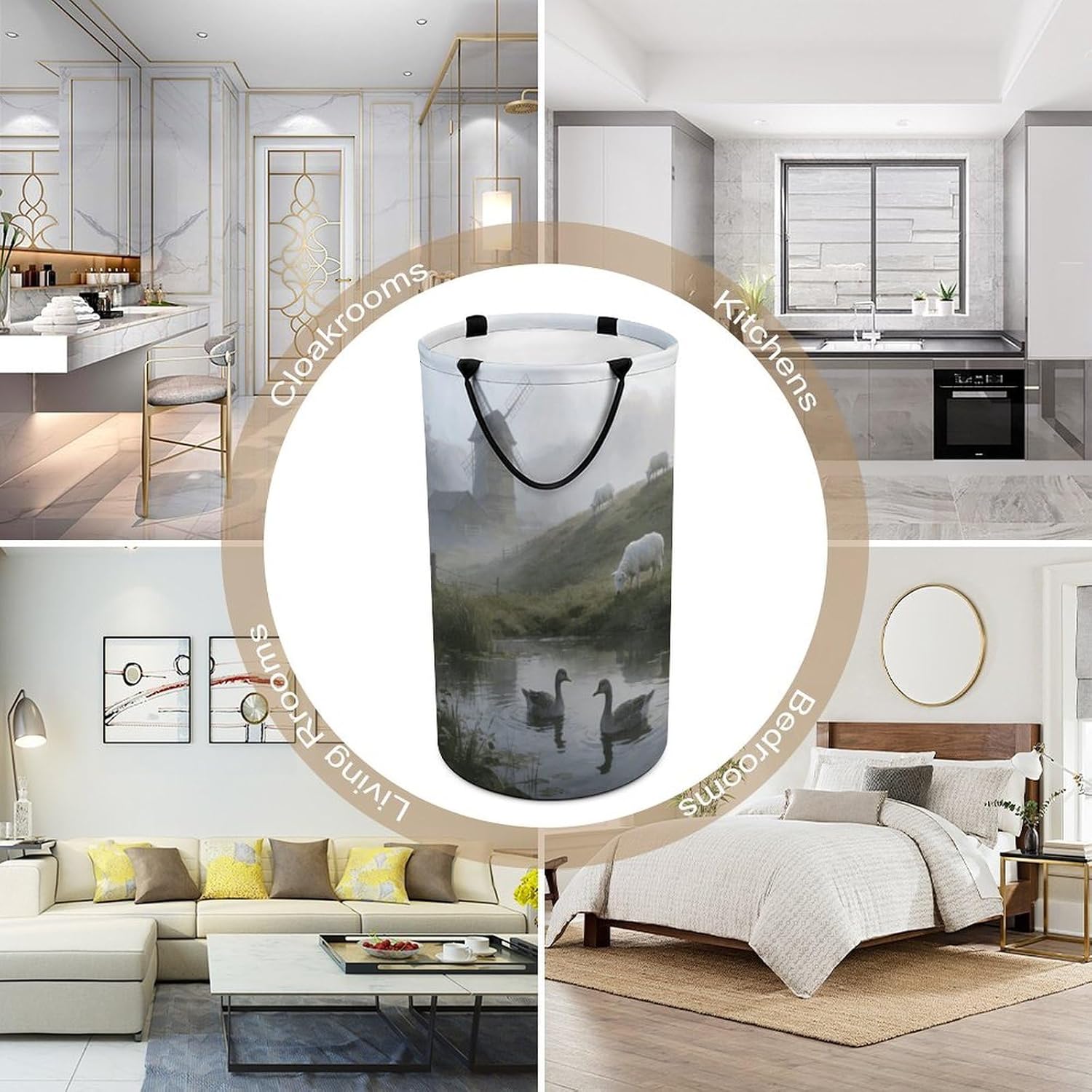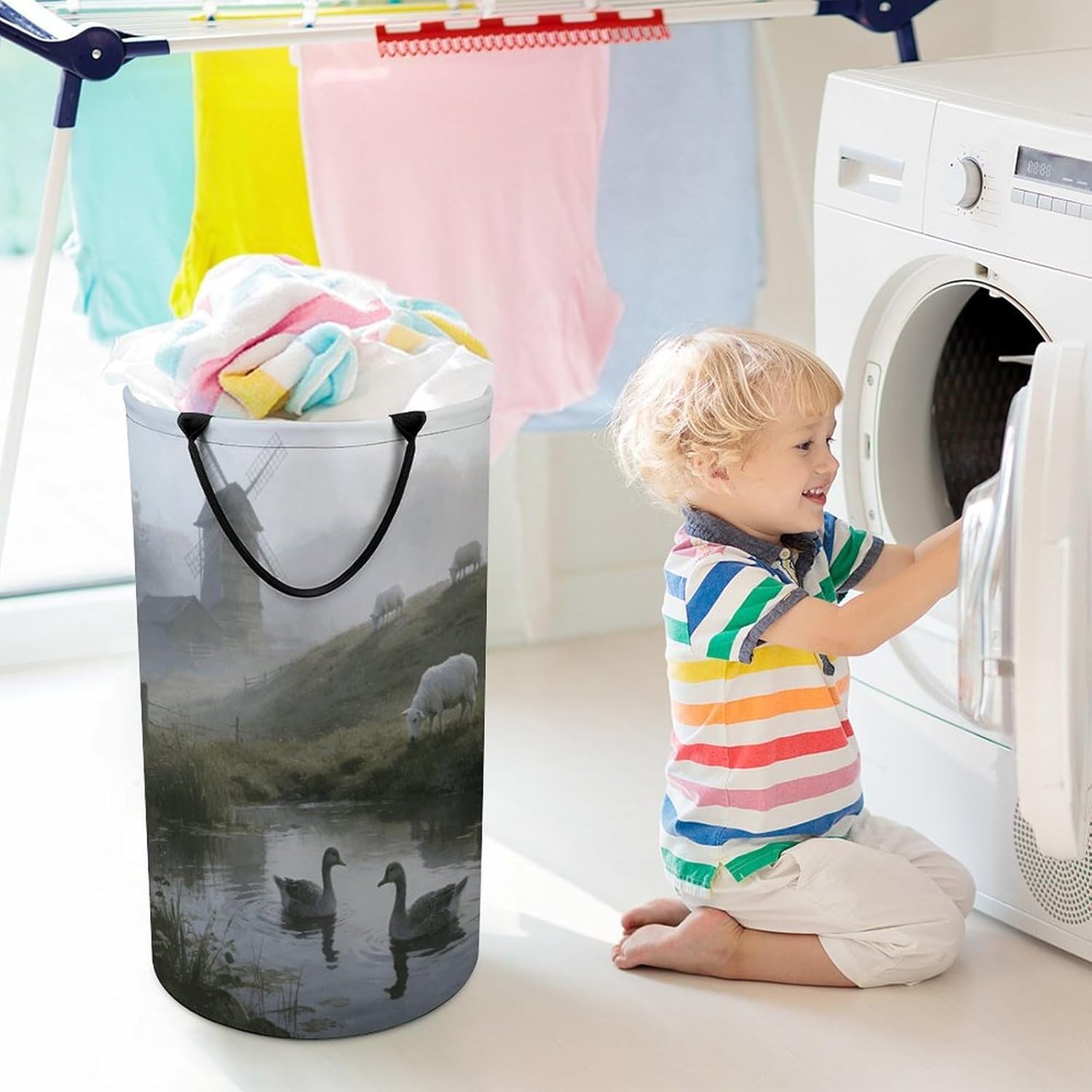 The pattern of the Stream Geese And Slope Sheep hamper is printed with exquisite patterns, which makes the product more attractive.Chic design allows it to be used in the living room to hold throw blanket, pillows, and reading materials, as well as in the bathroom for towels, or as a laundry hamper.The laundry hamper adopted collapsible design, equipped with handles. It is lightweight and portable for using, storing, and moving conveniently.Stream Geese And Slope Sheep Clothes hamper is suitable to store dirty clothes washing, place in the room to store toys, and other household goods, keep the house clean and tidy. Perfect laundry hamper for home, office, closet organizer, bedroom, bathroom, college dorm, etc.Gets out of your way when you need it to. This storage basket or laundry hamper is a good gift, which not only meets everyday storage needs but also carries deep care and love, a perfect way to turn thoughtfulness into warmth.