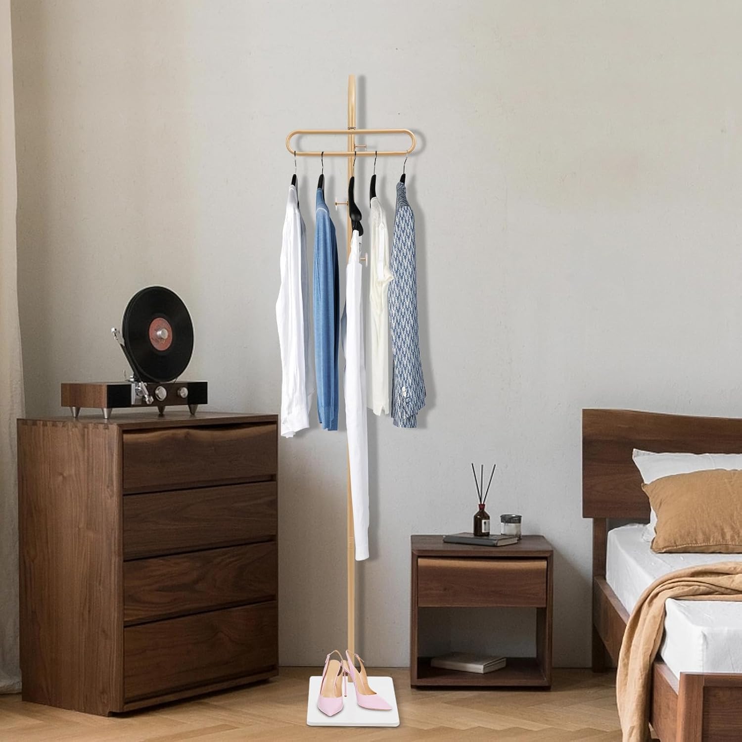 Tall Coat Racks Stand with Side Hooks and BaseIt can be used in hallways, bedrooms, living rooms, entryways, foyers, study rooms, children's rooms, laundry rooms, offices, clothing stores, apartments, hotels, dormitories, etc., to hang coats, windbreakers, jackets, scarves, hats, school bags, handbags, suits, garments, and place shoes, etc.Gold Metal Coat Rack with Slate Base-Details3 Round Head Hooks: They are not only aesthetically pleasing but also prevent clothes from falling off and care for your clothes and hands.Sturdy Base: The rectangular slate base measuring 15.7*9.8 inches can well stabilize this product and prevent it from tipping over.Non-slip Foam Pads: They prevent the product from sliding for higher stability and protect the floor from scratches. In addition, 4 spare foam pads allow for convenient replacement.Smooth Edge: The rounded and smooth edges not only add to the aesthetics of the product but also improve the safety of use.SpecificationsColor: Gold+ WhiteStyle: ModernShape: L-shapeMaterial: Iron, Slate, FoamProcess: High-temperature Baking PaintRecommended Uses For Product: Coats Mounting Type: Floor StandingAssembly Required: YesNumber of Hooks: 3Total Load Capacity: About 15kg/33.07 lbsTube Wall Thickness: 0.5mm/0.02inProduct Height: 175cm/68.9inBase Size(L*W): 40*25cm/15.7*9.8inPackage Size: 51.5*41*7cm/20.28*16.14*2.76inGross Weight: 3.7kg/8.16 lbs Net Weight: 3.5kg/7.71 lbsPackage Included1* Coat Rack 1* Chinese& English Assembly ManualAll Accessories for Assembly