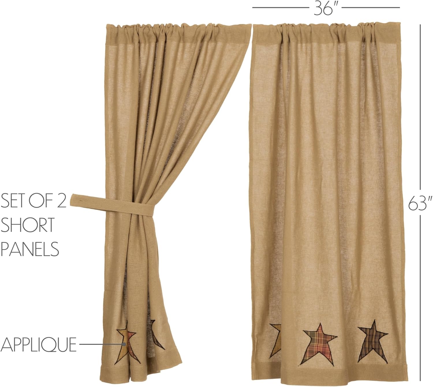 Create a timeless, primitive home with soft, warm and inviting natural tan cotton burlap. The Stratton Burlap Short Panel Set of 2 63x36 fits classic country and modern primitive looks with loosely woven cotton burlap accented by folk art style applique stars in bright shades of red, orange and yellow plaid. The unlined curtains create the perfect balance of light and privacy. For easy hanging, slip the curtain rod of your choice through the 3.25 inch rod pocket. Includes matching tie backs. Machine washable and iron safe for easy care.